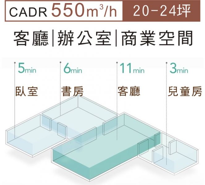 P550清淨機使用空間550m3/h20一24坪CADR客廳|辦公室|商業空間mln客廳兒童房